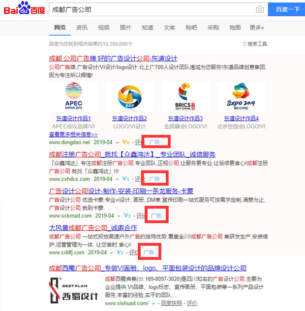 上圖以搜索“成都廣告公司”這一關鍵詞為例,前面四條都屬于廣告,區分是不是廣告推送可以從紅色標記部分進行區分,后面沒有“廣告”二字的就是正常內容可以放心點擊查找心儀的廣告公司進行合作啦。