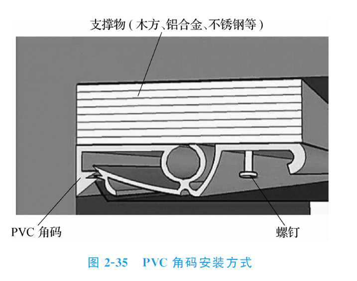 1、在需要安裝軟膜的地方,首先把PVC角碼(PVC龍骨)的支撐物固定好(支撐物可以是方木,鋁合金,不銹鋼等)。然后,把PVC角碼碼釘或射釘固定在支撐物上,再用專用插刀把軟膜固定在PVC角碼上,如圖所示。