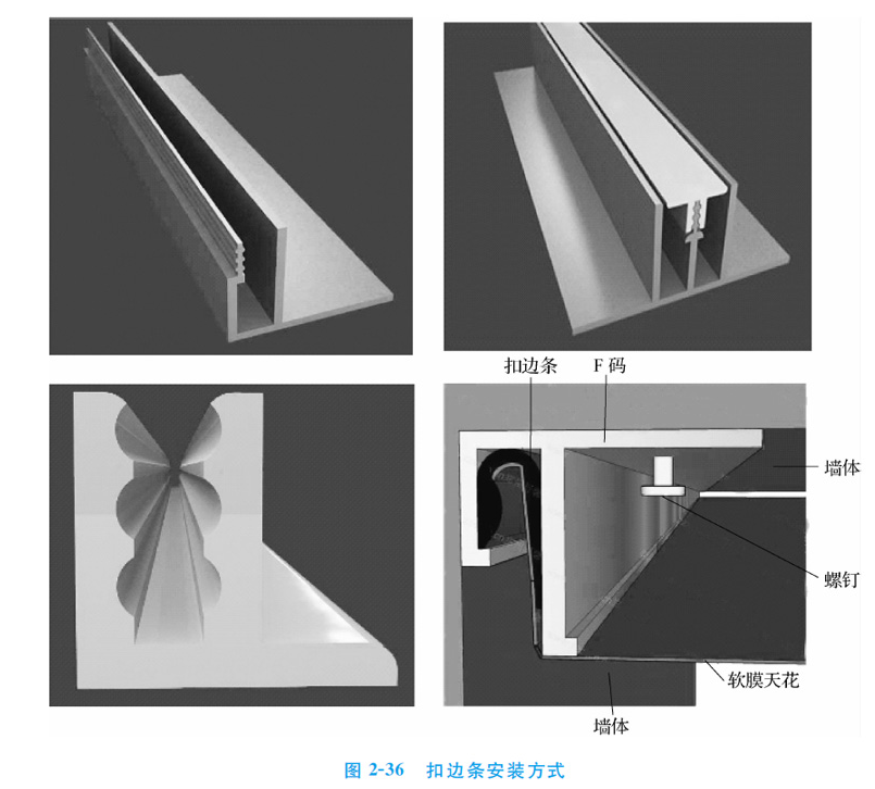 2、扣邊條安裝方式:首先根據圖樣設計要求,在需要安裝柔性軟膜吊頂的水平高度位置四周固定-圈40mm*40mm的支撐龍骨(可以是方林或方鋼管)。 在所有支撐龍骨固定完成后,在其固定安裝柔性軟膜吊頂的扣邊條(F碼,同- -構件)龍骨,如圖所示。