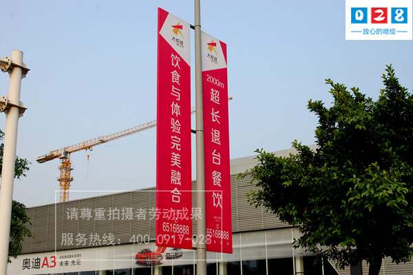5、燈桿道旗:道旗一般設置在銷售樓盤周邊以及道路的主路、輔路、便道以外的范圍,可以在短期內樹立廣告主品牌效果。