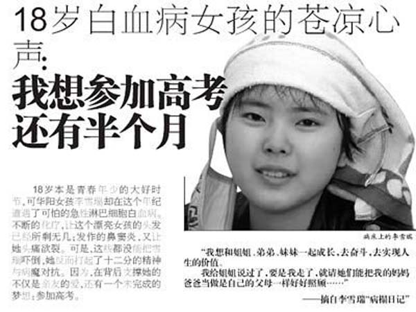 4月中旬,雪瑞堅持回到學校上課,第二天就暈倒在課堂上。隨后一個噩耗襲來:雪瑞患的是急性淋巴細胞白血病! 她失去了上大學的機會,也再次改變了她整個家庭,全家人再次陷入痛苦的深淵。