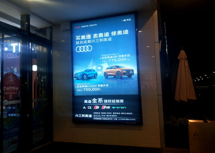 有二種顯示信息懸架式燈箱的方式 。一種是單雙面懸架。單雙面懸架代表著燈箱的廣告僅有廣告的一側,而另一側是空缺。這類廣告關鍵用以店鋪營銷中。廣告是以吊頂天花板上懸架燈箱以節約室內空間的一種方法。還有一個兩面懸架。兩面懸架如同每一個人都想的那般。它就是指燈箱兩邊能夠 顯示信息廣告的方法。這類燈箱關鍵用以咖啡廳/大中型購物廣場/房地產業。在窗戶嘴中,顧客能夠 見到廣告,不管他們在內部還是外界。它是很多公司選用的方式 。