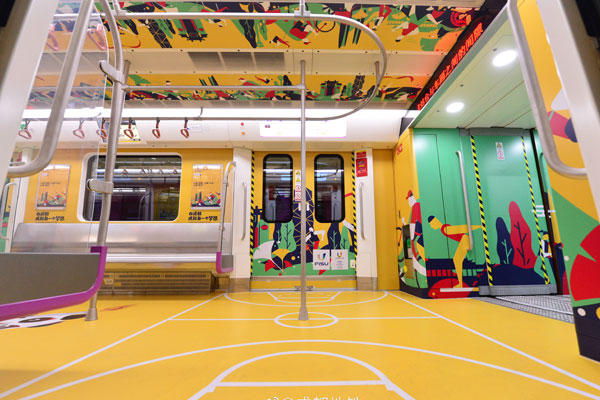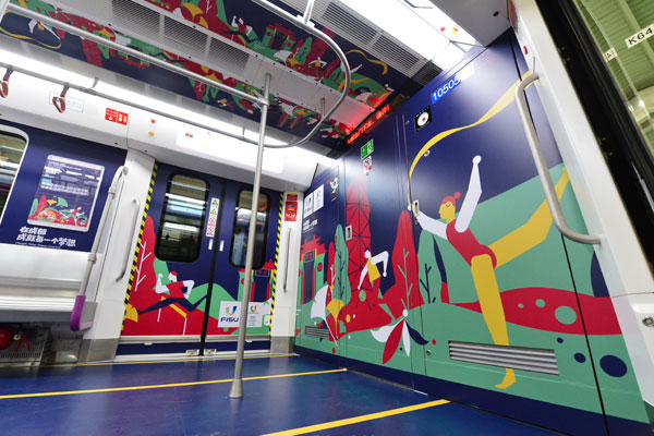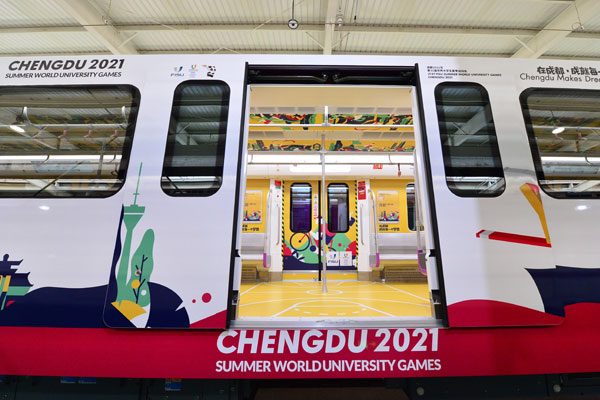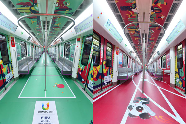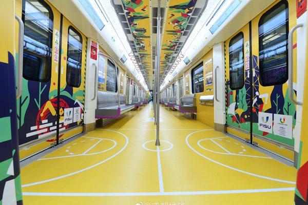 “大運(yùn)號(hào)”主題車以“在成都 成就每一個(gè)夢(mèng)想”為主題的列車以紅、黃、藍(lán)、綠四種顏色為主基調(diào),車廂可以明顯看出大運(yùn)經(jīng)典U形符號(hào)輪廓,以蓉城“市樹”銀杏作為點(diǎn)綴,以抽象畫的形式表現(xiàn)大運(yùn)體操、跳水等運(yùn)動(dòng)競(jìng)技項(xiàng)目。