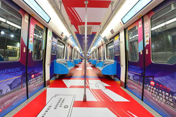 每節車廂車身用變形彩虹飄帶貫穿頭尾,預祝“蓉漂”人才在成都國企綻放自己的絢麗人生。6節車廂分別提取文旅、環投、興城、金控、成都銀行、錦泰的Logo色,與主色調相互輝映。