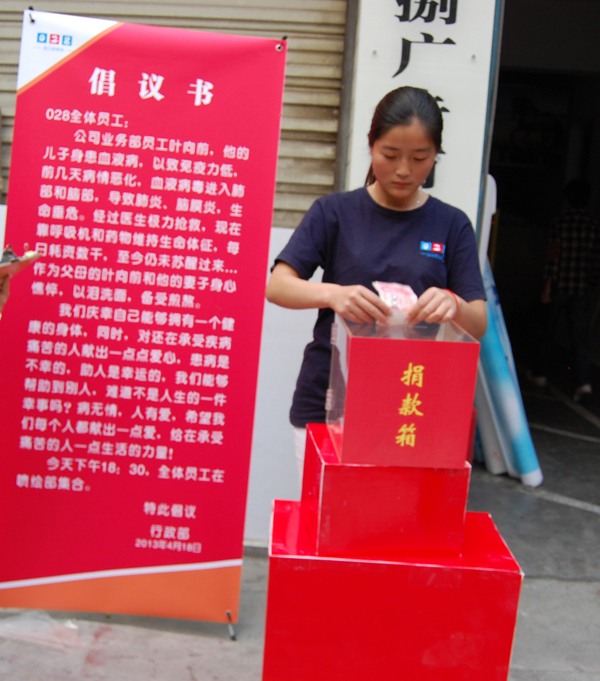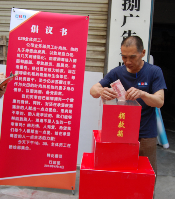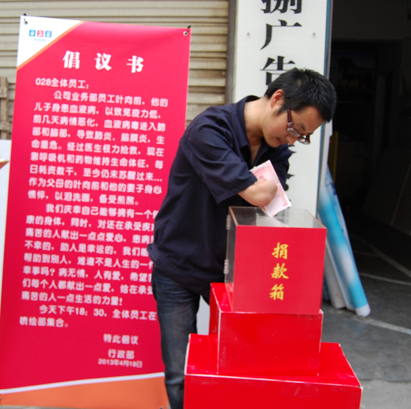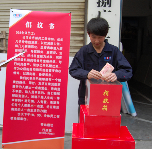 公司領(lǐng)導(dǎo)得知這一消息后,為他感到非常擔(dān)心,總經(jīng)理汪平江親自前去看望,并送上慰問金。4月18日,028董事會倡議進行愛心捐款,下午18:30,全體028員工在公司門口集合,排隊依次進行捐款,一份份的真情,愛的力量在這一刻匯流成河……