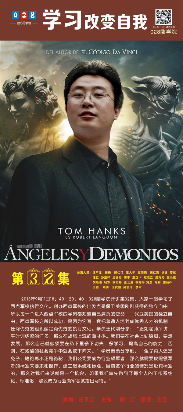 2013年9月11日18:40—20:40,成都廣告公司028商學(xué)院開講第32集,大家一起學(xué)習(xí)了西點軍校執(zhí)行文化。創(chuàng)辦西點軍校的出發(fā)點是保衛(wèi)美國剛剛獲得的獨立自由,所以每一個進入西點軍校的學(xué)員都知道自己肩負(fù)的使命——保衛(wèi)美國的獨立自由。西點軍校之所以成功,是因為它有一套把普通人培養(yǎng)成優(yōu)秀人才的機制,任何優(yōu)秀的組織必定有優(yōu)秀的執(zhí)行文化。