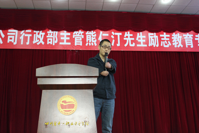 據了解,熊仁汀9歲時因遭遇電擊失去了雙臂,靠著堅韌的毅力和自立自強的決心戰勝重重困難,堅強地面對生活和學習,2003年以高出當年本科錄取線51分的好成績考入西南石油大學,大學畢業后經歷了兩年艱苦的自主創業后于2009年底進入四川零貳捌廣告有限公司工作,從最基層的一名庫管做起,一步步做到公司的行政部主管并成為了公司的股東之一。