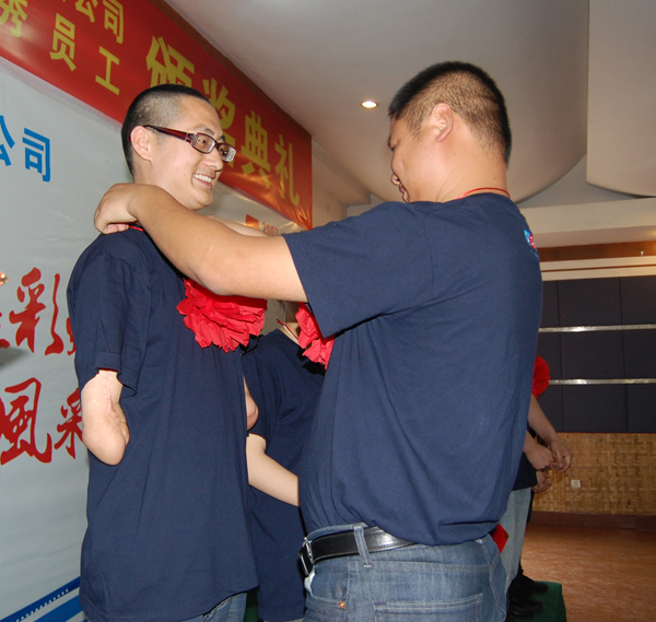 公司總經理親自為優秀員工帶上大紅花以表示感謝,他為公司付出青春和汗水。