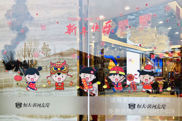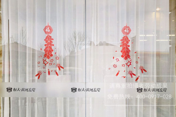 恒大濱河左岸樓盤營銷中心入口玻璃門春節(jié)裝飾貼紙制作安裝