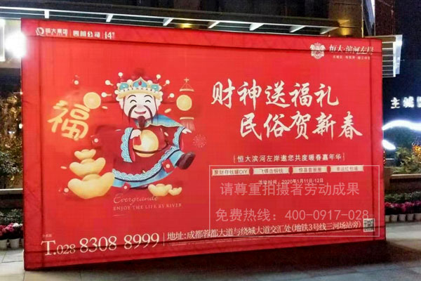 “財(cái)神送福禮,民俗賀新春”恒大濱河左岸樓盤桁架廣告制作安裝