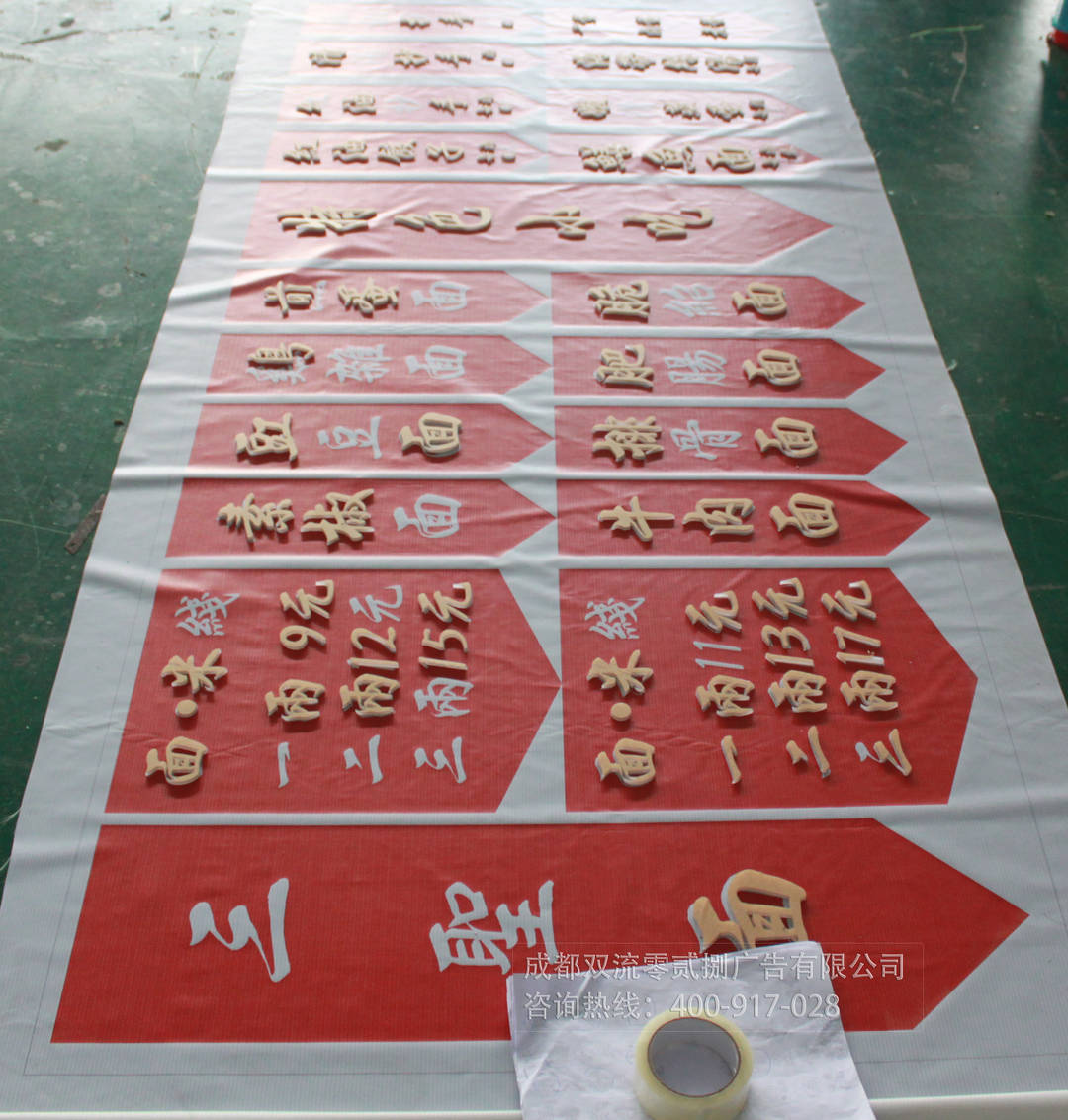底部是運用了厚實的噴繪布能夠讓裝飾品更有質感,紅色部分采用了成都零貳捌廣告公司的UV噴繪,并且字體是運一種設計師廣泛運用的亞克力的材質,人工雕刻打磨而成,整個裝飾顯得質感和設計感十足。