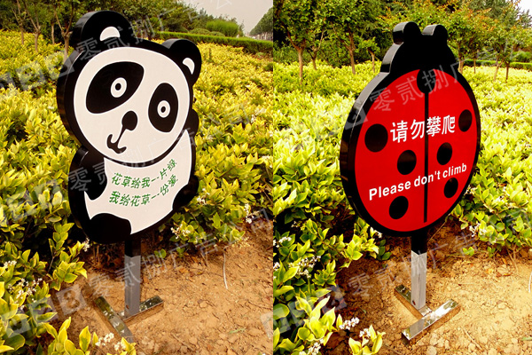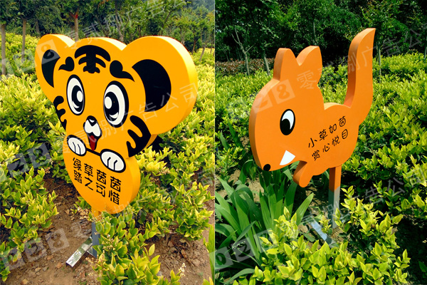 花草牌一般造型多樣,美觀可愛,有動物造型,有花草造型,還有各種設計元素造型等。色彩多數也比較艷麗,為了能在花草叢中凸顯出來,顏色多為暖色為主。或根據該單位來的標準色來決定色彩。