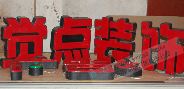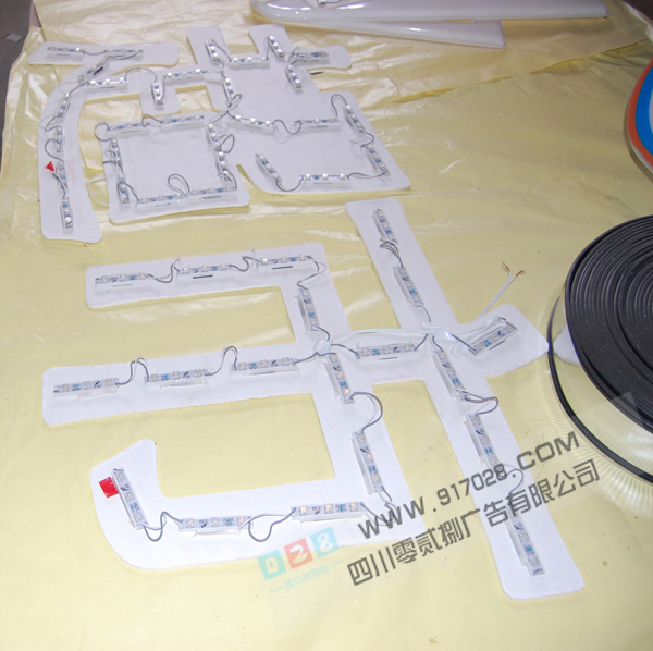 內嵌LED發光模塊:已完成LED發光模塊安裝的吸塑字內部圖片。LED模塊采用國內知名品牌的食人魚LED發光模塊,具有亮度高、壽命長、光衰小、能耗低的特點。供電線路經專業技術人員設計,具有回接線路,能夠有效避免短路等情況的發生。