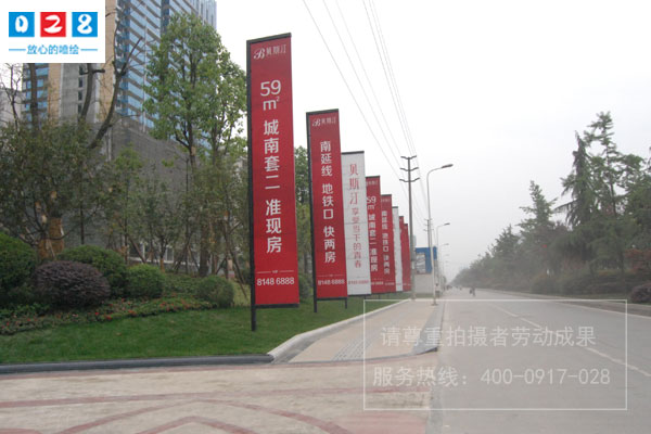 下面跟著我們四川零貳捌成都房地產(chǎn)廣告公司的視角一起來看看我們?yōu)槎嗉曳康禺a(chǎn)公司樓盤項目制作安裝的燈桿道旗廣告:
