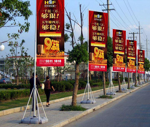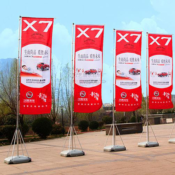注水旗的旗桿則會有三米、五米以及七米等高度,一般注水旗的水會放置在注水旗的底座,起到一個壓制的作用,不用擔心風大吹跑了。一般三米的注水旗會使用到十二斤的水,則水的重量會隨著注水旗的高度而合理的增加。